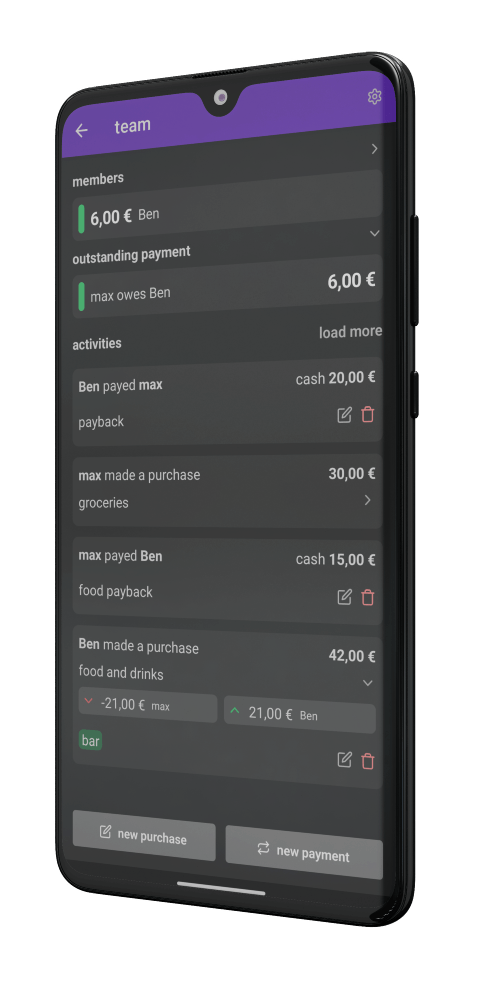 Verwalte muehelos Einkaeufe innerhalb deiner Gruppen und erhalte eine klare Aufschluesselung der Ausgaben um eine gerechte Verteilung unter den Mitgliedern zu ermoeglichen.
